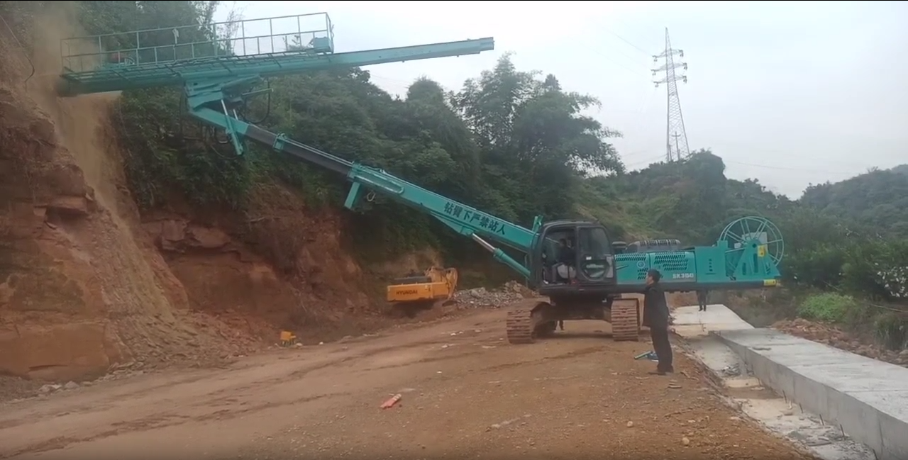 全地形挖掘機:區別于常規履帶式和輪胎式挖掘機,步履式挖掘機底盤克服了輪胎式的接地比壓大,爬坡能力弱和傳統履帶式不能再復雜地形工作的缺點。利用四條獨立多自由度的液壓支腿進行自由角度調整,補償地形凹凸高度差,實現在大角度傾斜地形行駛,行走,施工的目的。利用箱型伸縮工作臂與獨立多自由度的液壓支腿的配合作用,能攀登翻越較高的垂直障礙物。